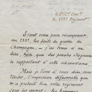 Colonel Pierre-Emile de VALLIERES – Lettre autographe signée – 1ère Guerre Mondiale